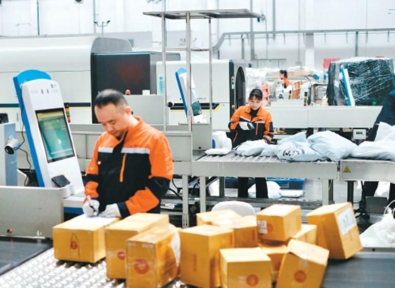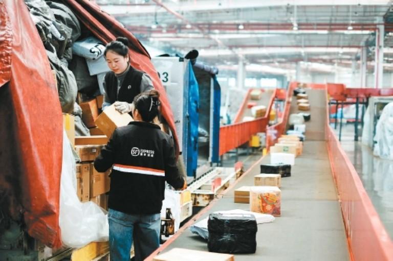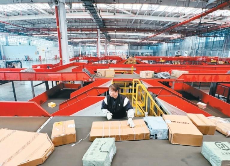 货运代理人在综合线体上将不同流向货物进行分拨处理。