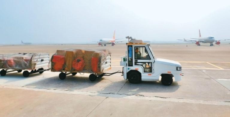 工作人员准备向飞机上装载货物。(采访单位提供)